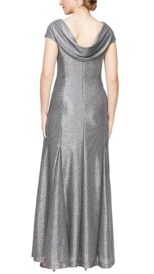 A-Line Cap Sleeve Metallic Knit Gown with Cowl Neck & Back Detail. Style ALE8127685