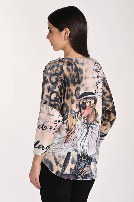 Abstract Prints & Girl with Phone Design Top. Style FL266562
