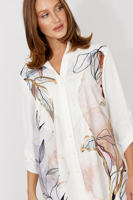 Button Front Leaf Print 3/4 Sleeve Top. Style FL266513