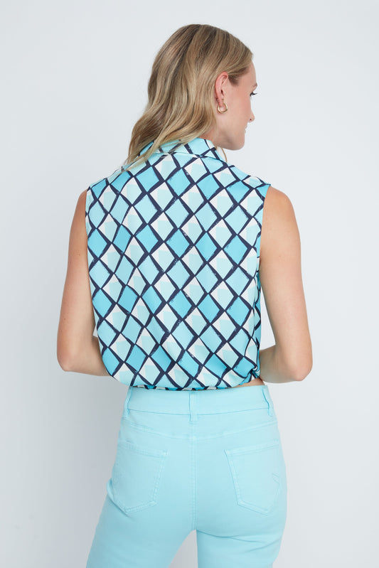 Diamond Print Sleeveless Tie Front Button Up Blouse. Style REN5246-465