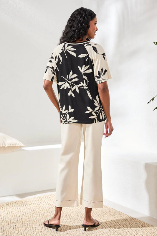 Ladder Stitch Leaf Print 3/4 Sleeve Top. Style MIMXM363