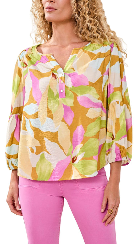Smocked Yoke Henley 3/4 Sleeve Blouse. Style TR2042O-8374