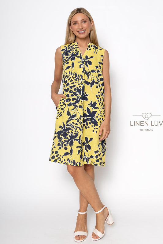 Buttons & Front Pleat Printed Linen Dress. Style LL1484