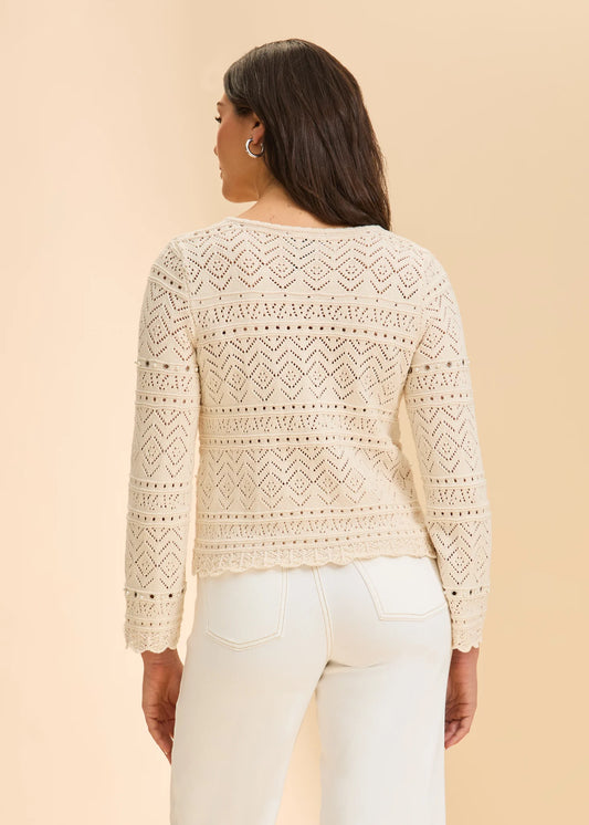 Pointelle Knit Metal Eyelet & Pearl Embellishments Sweater. Style FD1508314