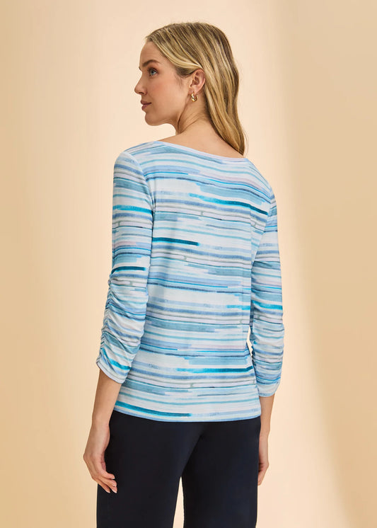 Striped Boat Neck 3/4 Ruched Sleeve Top. Style FD3481756