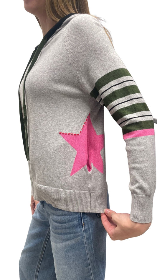Zip Front Striped Arms Star Details Hoodie. Style ZKP7537U