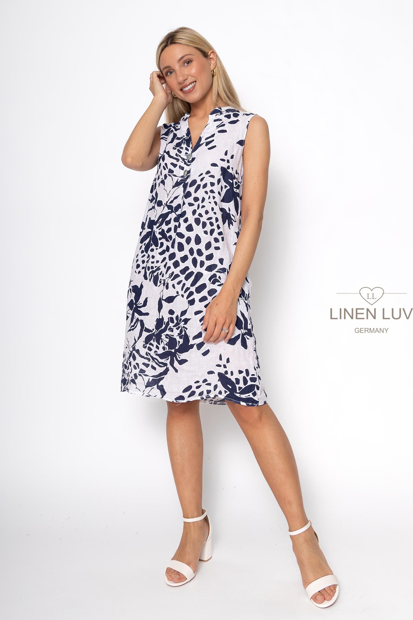 Buttons & Front Pleat Printed Linen Dress. Style LL1484