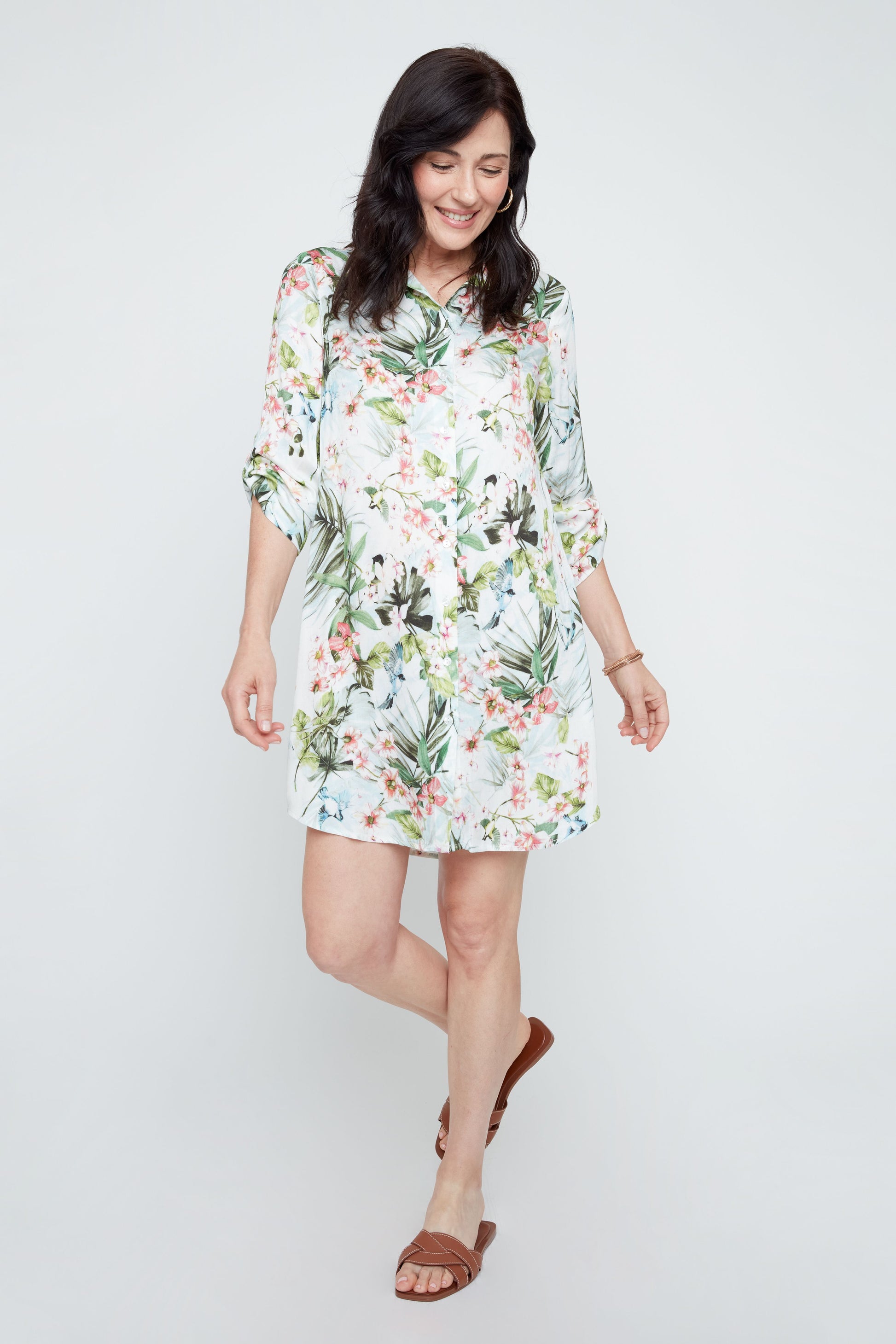 Roll-Up Sleeve Collared Tropical Print Dress. Style REN4372-984
