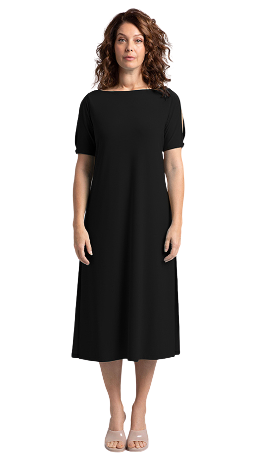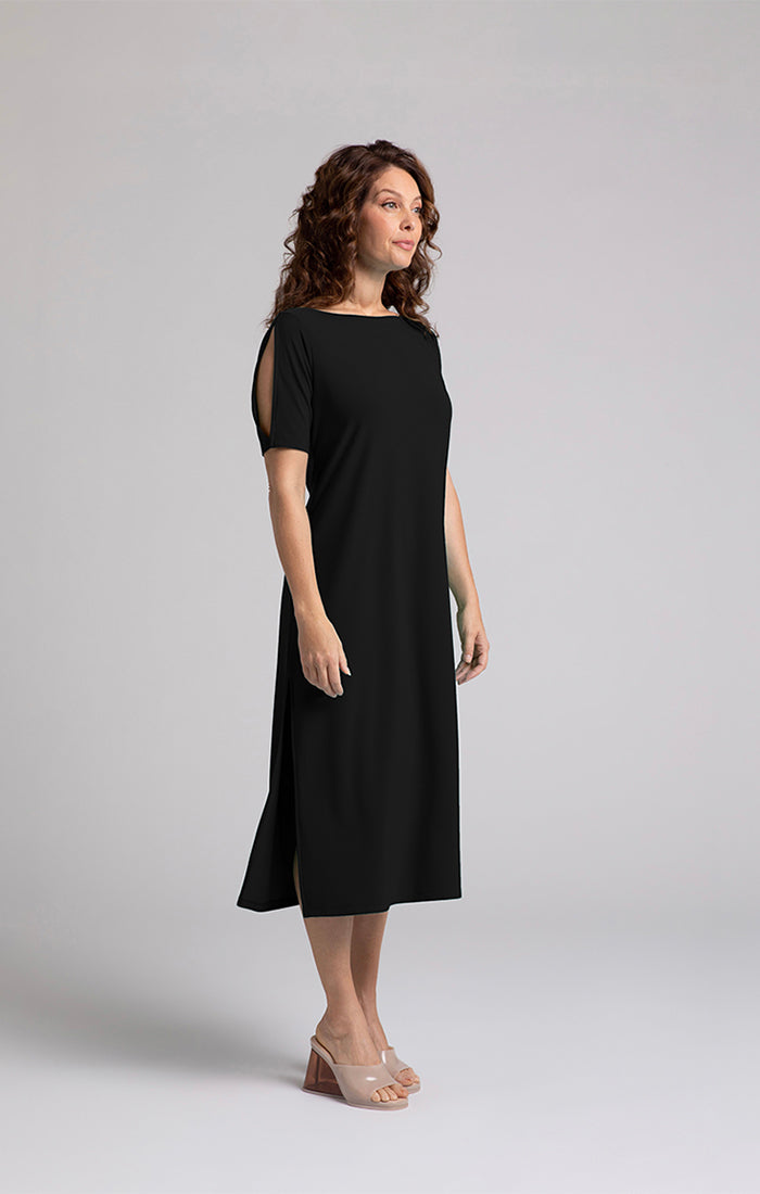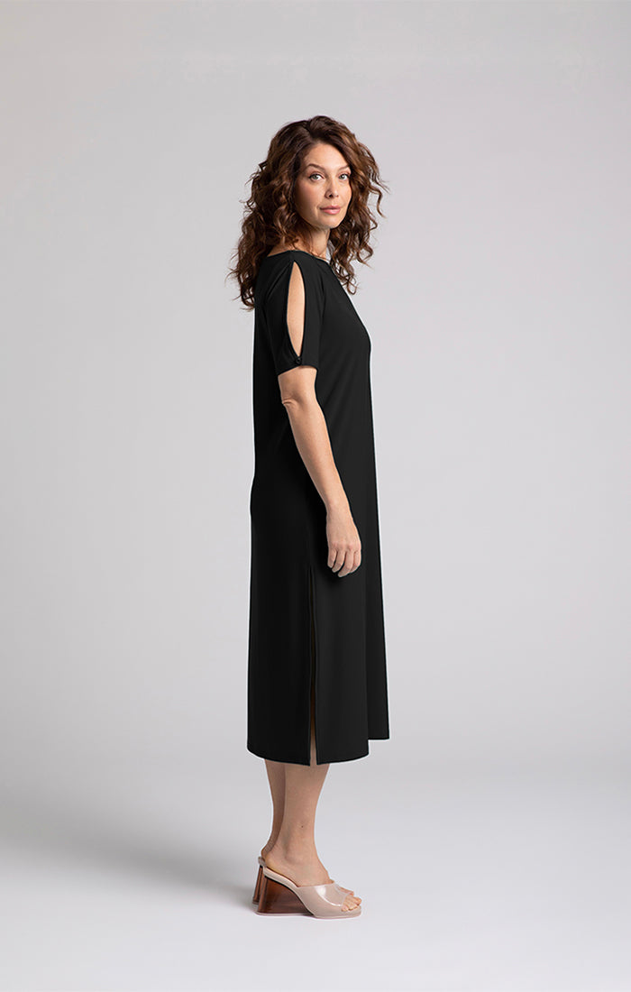 Boat Neck Slit Sleeve Midi Dress. Style SI28172-1BLK