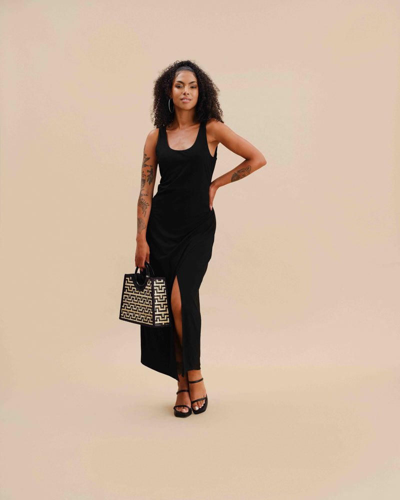 Sleeveless Leg Slit Ruched Side Dress. Style FS251423