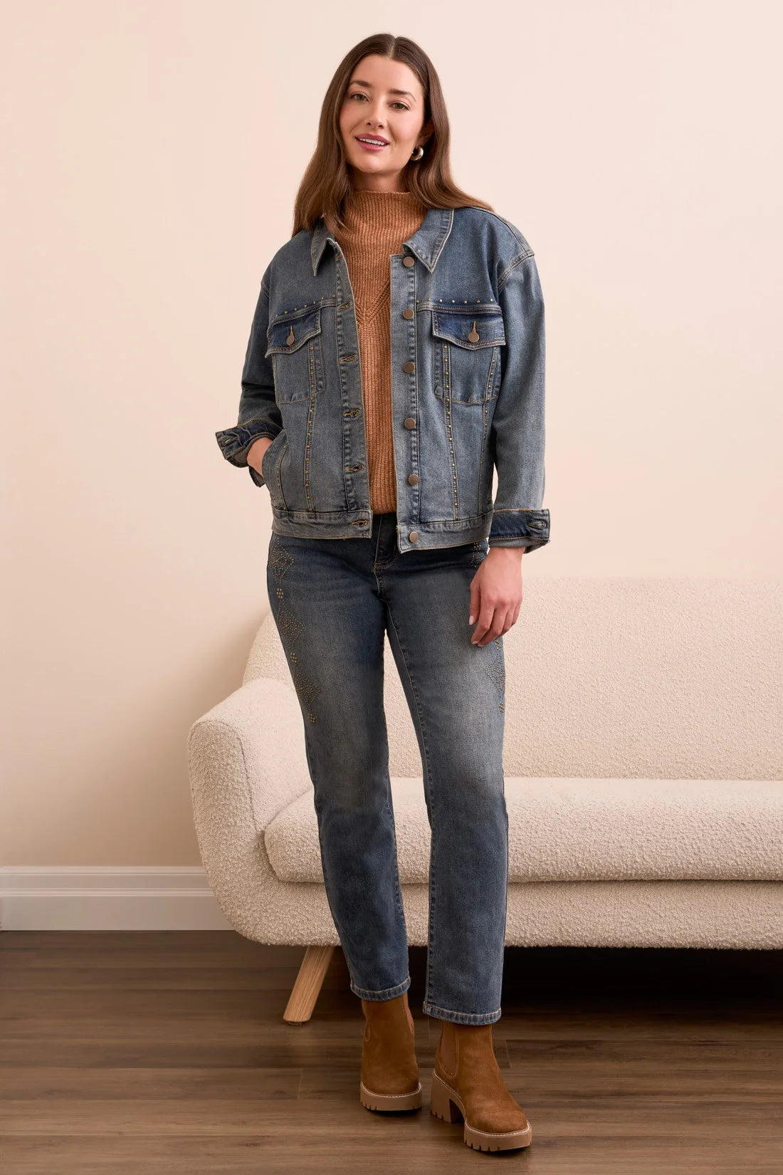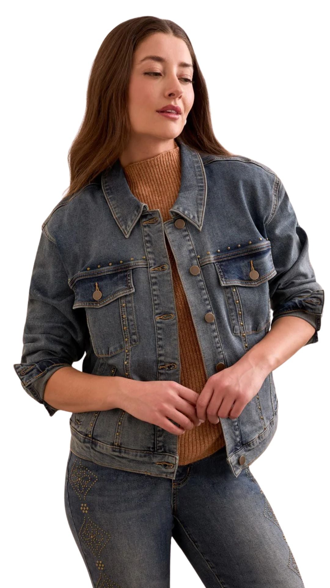 Studded Vintage Wash Denim Girlfriend Jacket. Style TR5956O-5229