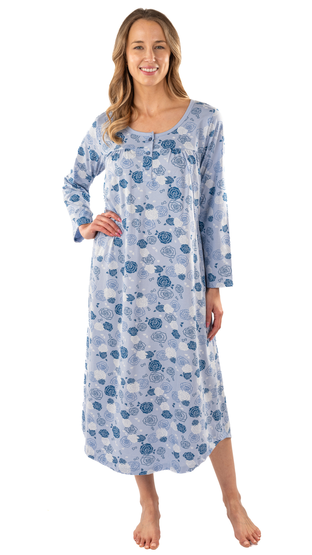 Rose Print Long Classic Nightgown. Style PL110BLU