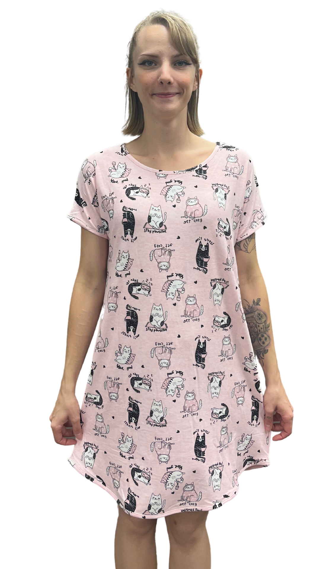 Don't Stress, Feline Good Print Night Shirt. Style COTYM-NSPNKCAT