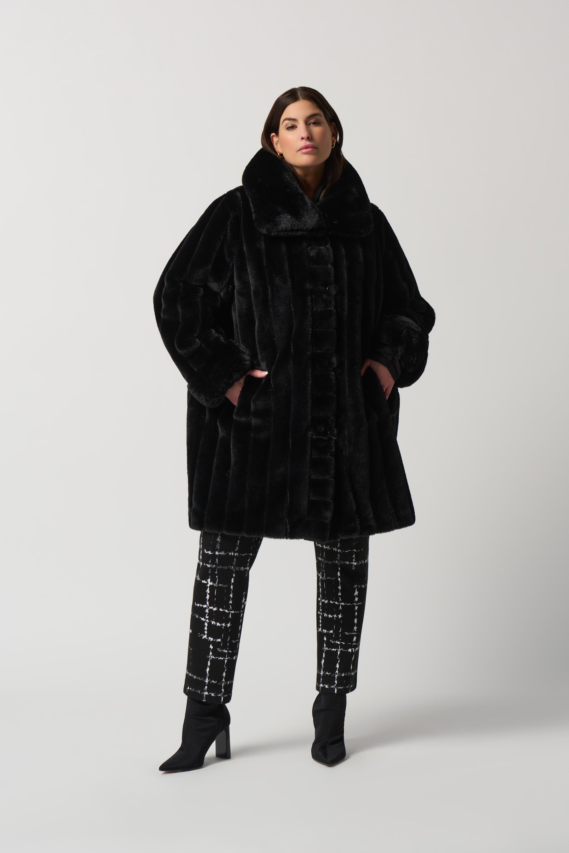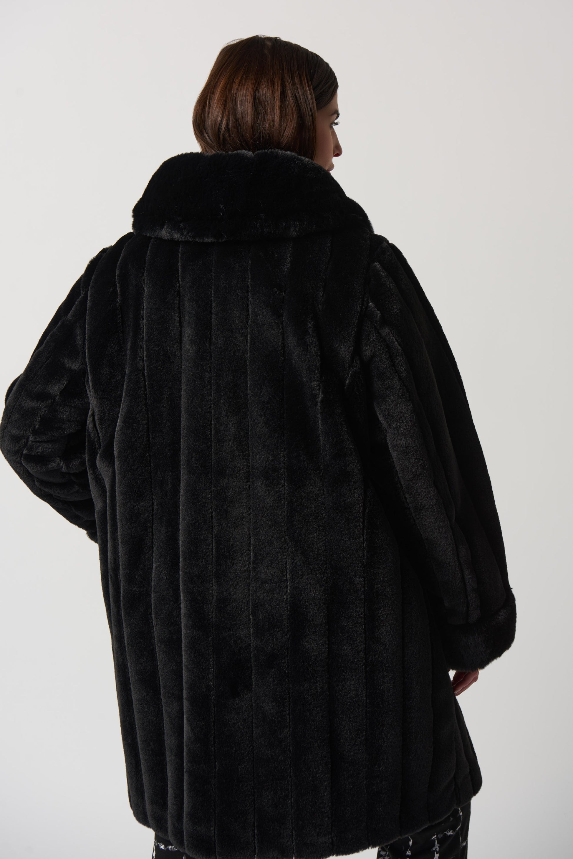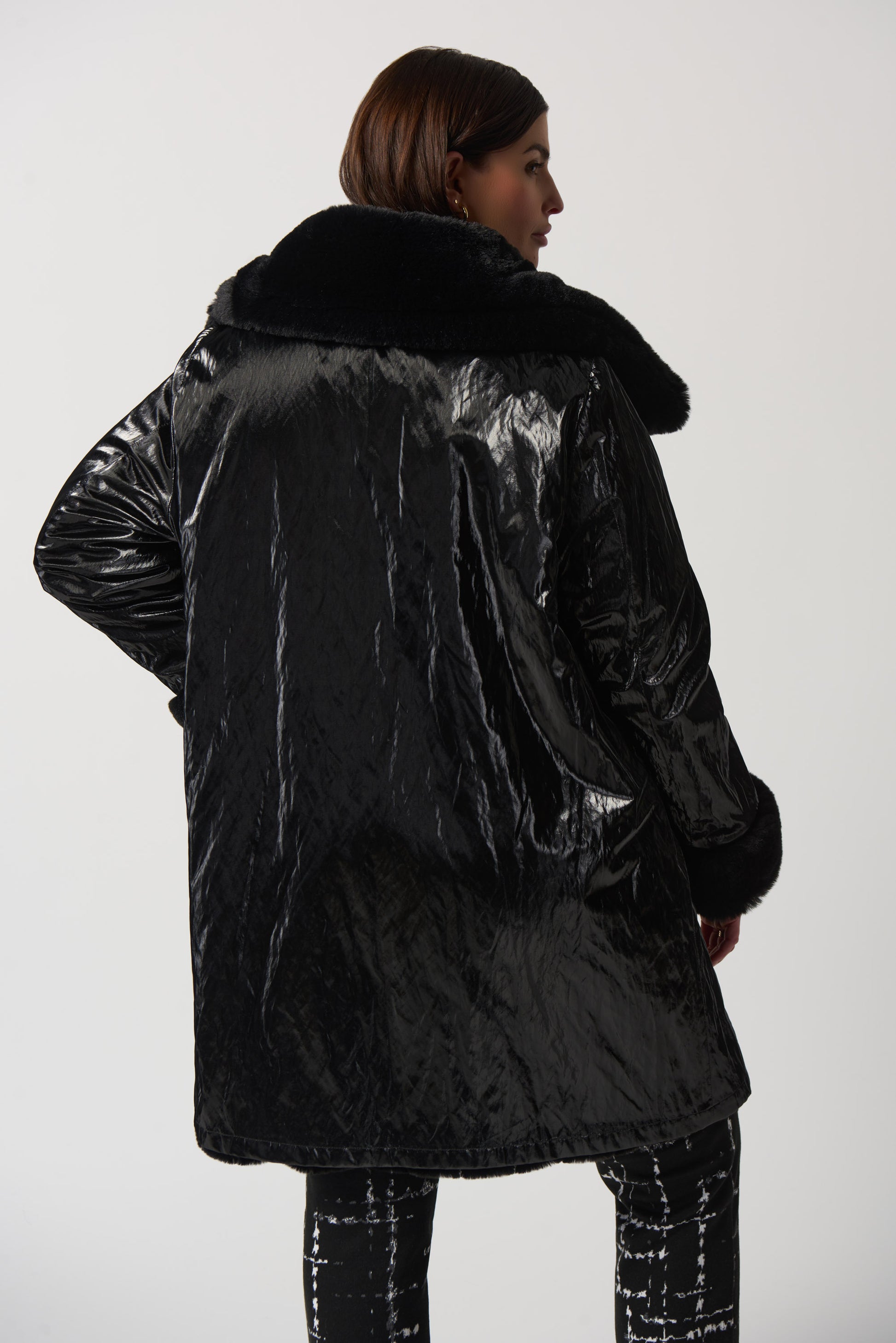 Faux Fur to Shiny Reversible Outerwear in Silver or Black. Style JR233900
