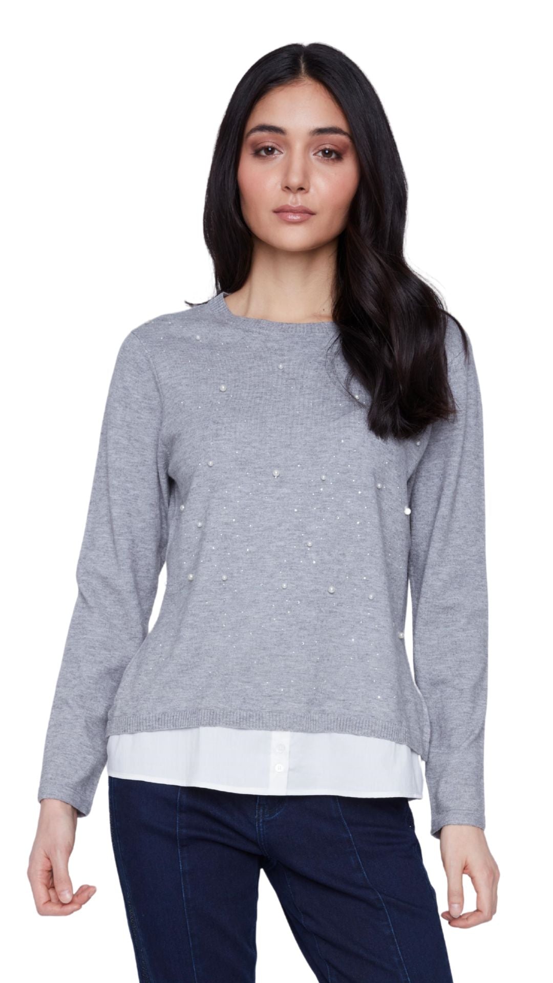 - All-Over Grey Sweater Knit with Rhinestones and Pearl Bead Details