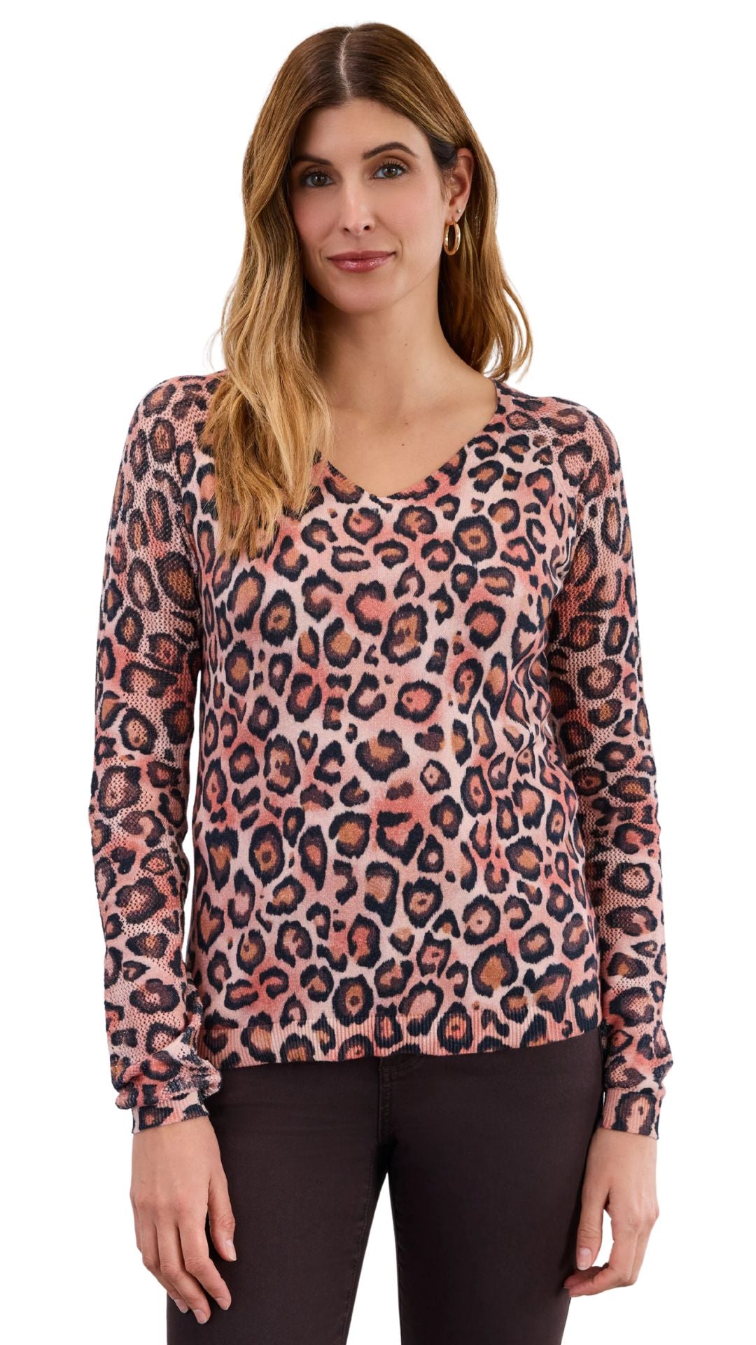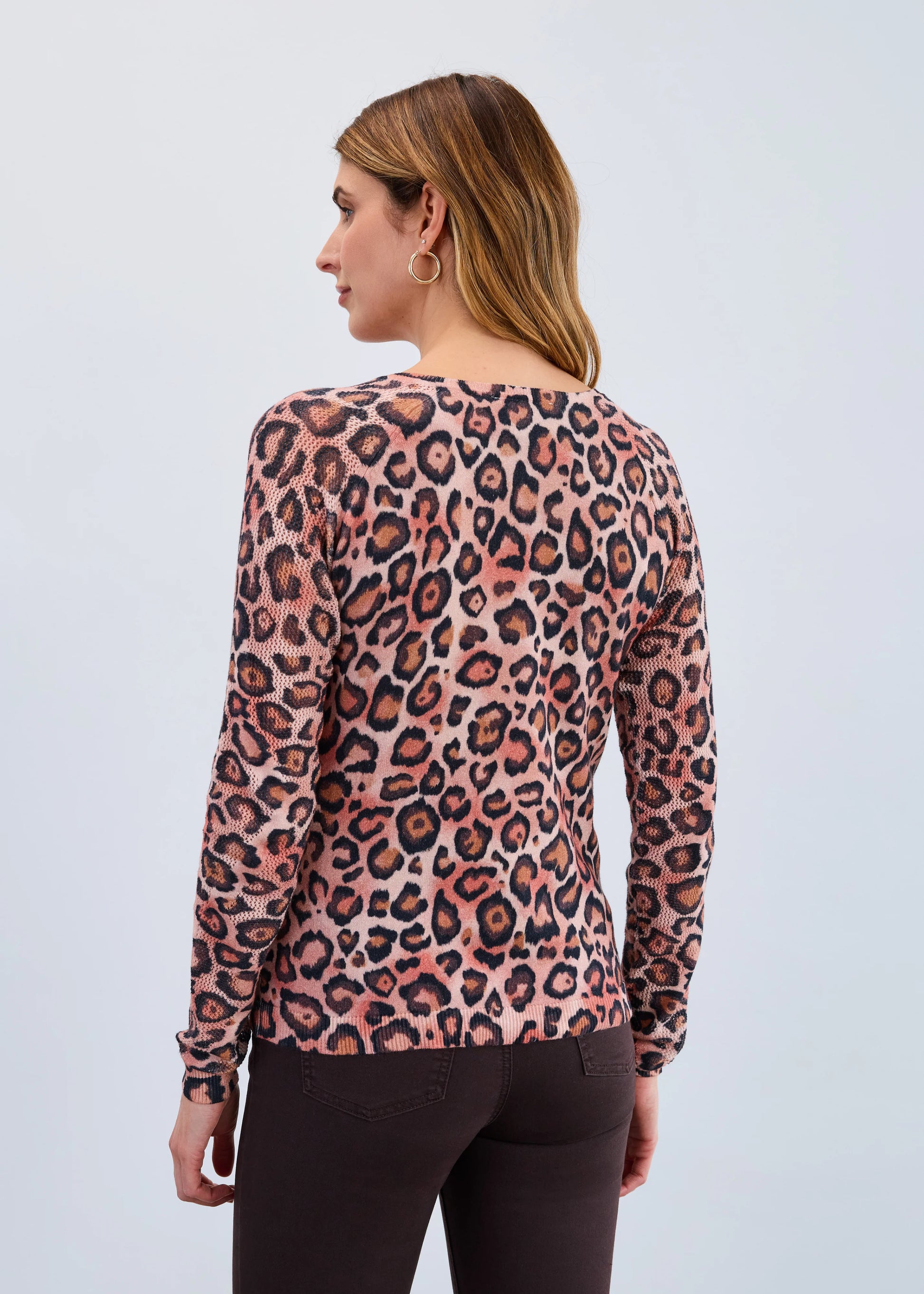 Light Leopard V-Neck Pointelle-Sleeve Sweater. Style FD1542314