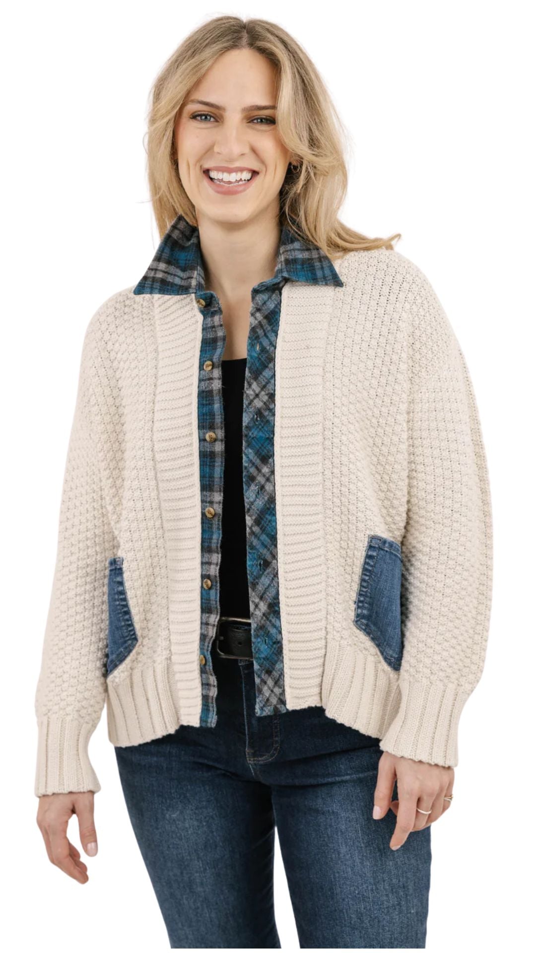 Denim Pockets & Flannel Strip Cardigan. Style SHNP5592