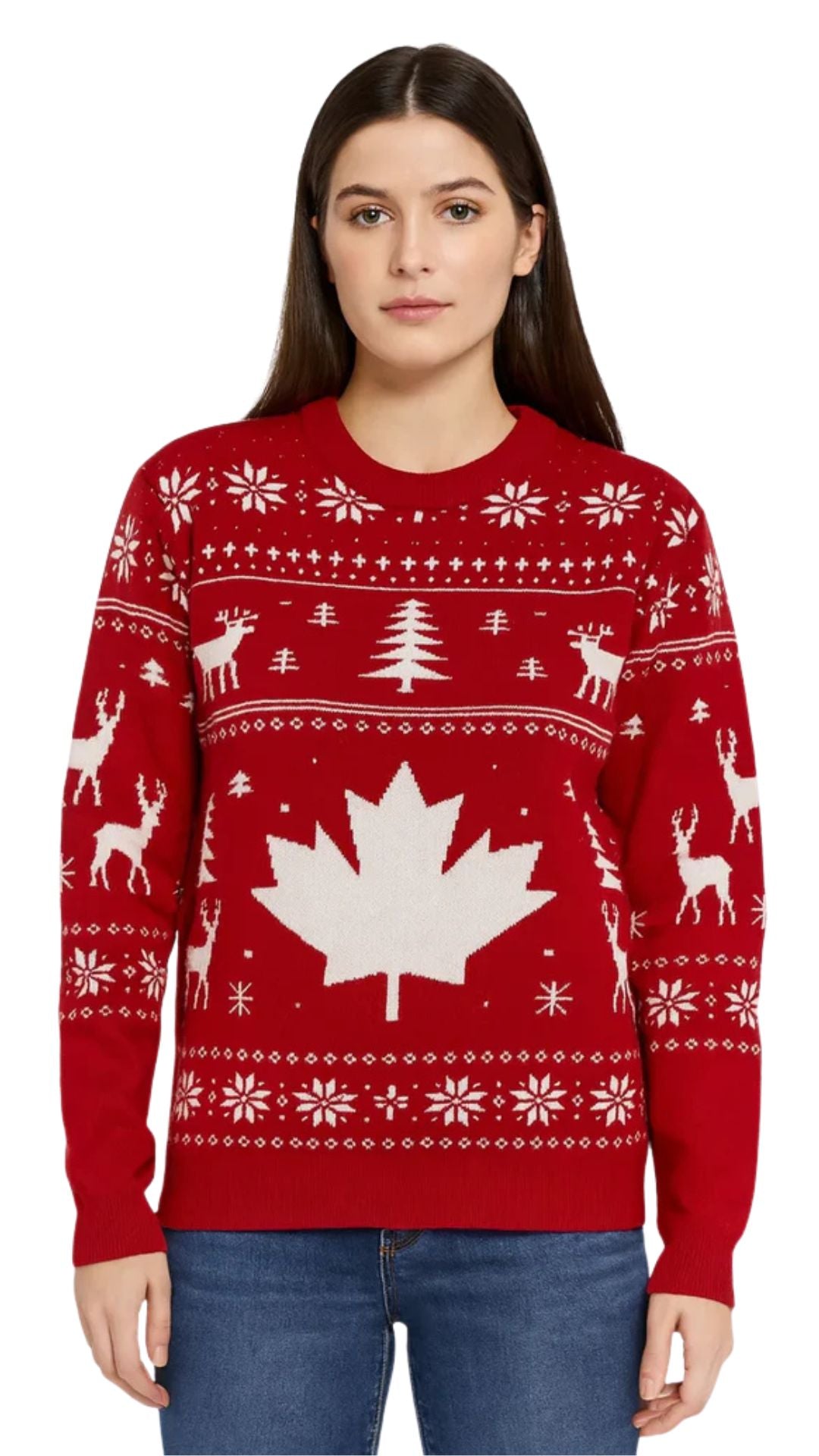 - All-Over White Festive Pattern With Reindeer, Trees and a Large Maple Leaf Design