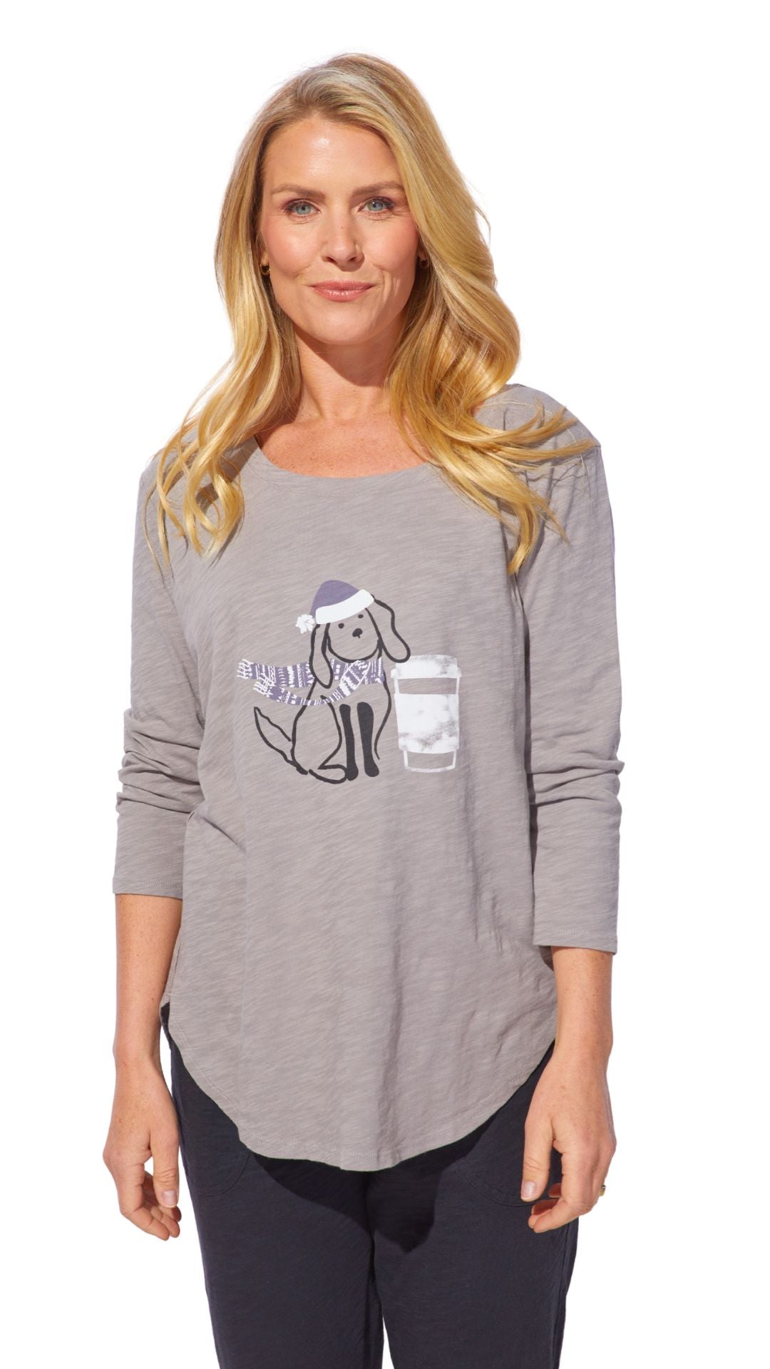 - All-Over Grey Colour with 'Dog in Santa Hat Drinking a Latte' Print