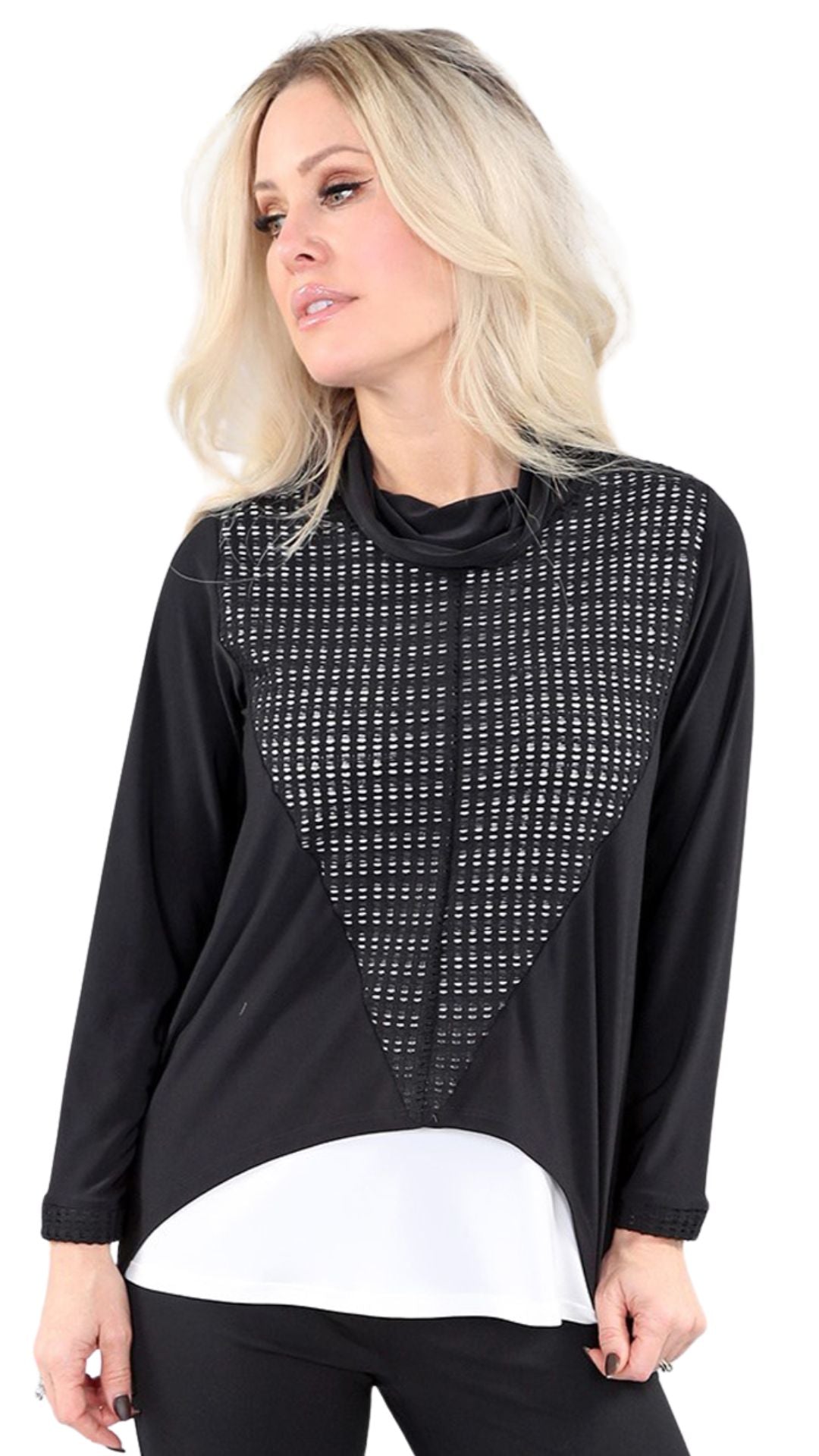 Cowl Neck Mesh Front Lace Cuff Top. Style MT25F1976